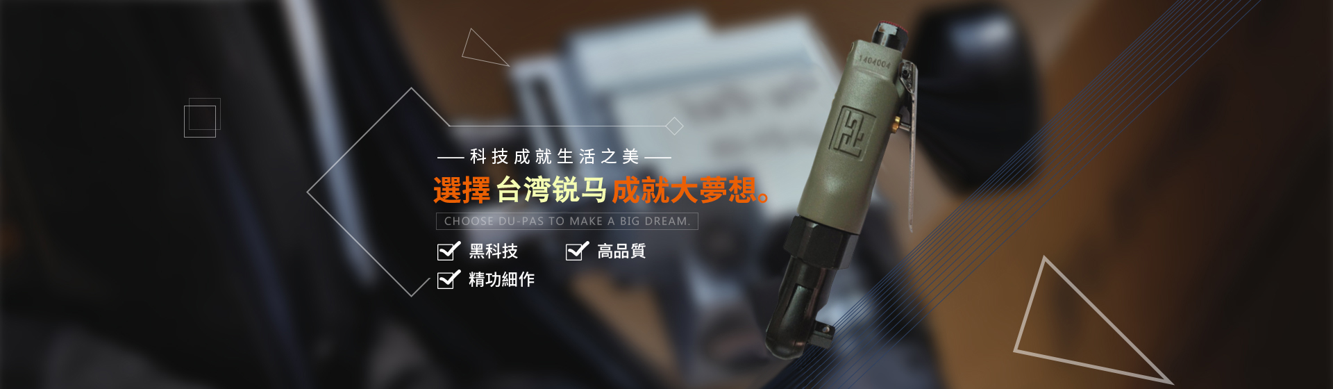 為給廣大客戶提供更加優(yōu)質完善的服務,臺灣銳馬氣動工具于2001年進入中國大陸市場,并以100%臺灣原裝進口氣動工具在大陸銷售銳馬、杜派氣動工具以及充電式電動工具。